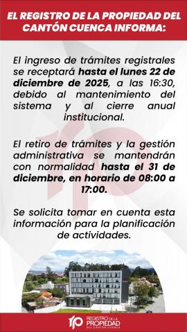 El ingreso de trámites registrales se receptará hasta el lunes 22 de diciembre de 2025, a las 16:30, debido al mantenimiento del sistema y al cierre anual institucional.